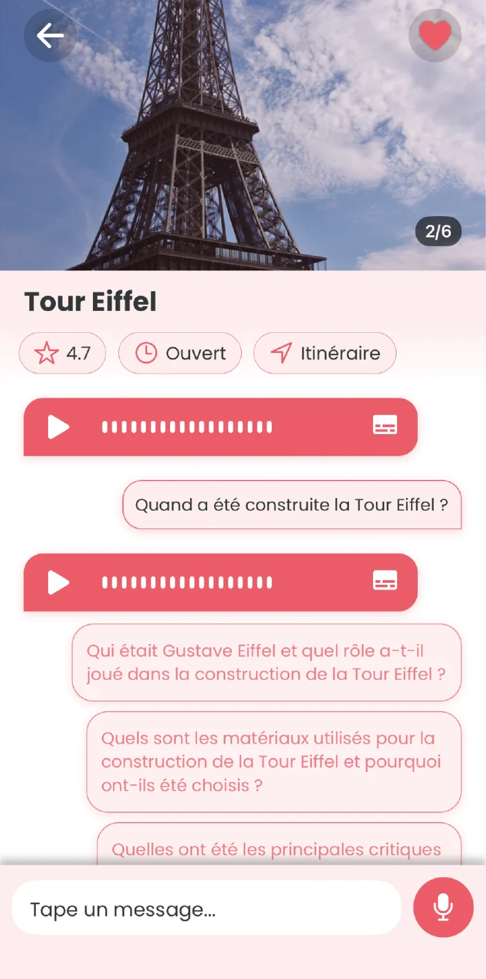 Ensuite, un contenu audio est généré en temps réel, dans votre langue, avec un ton naturel et adapté à votre style de visite : plutôt historique, insolite, artistique… c’est vous qui décidez.