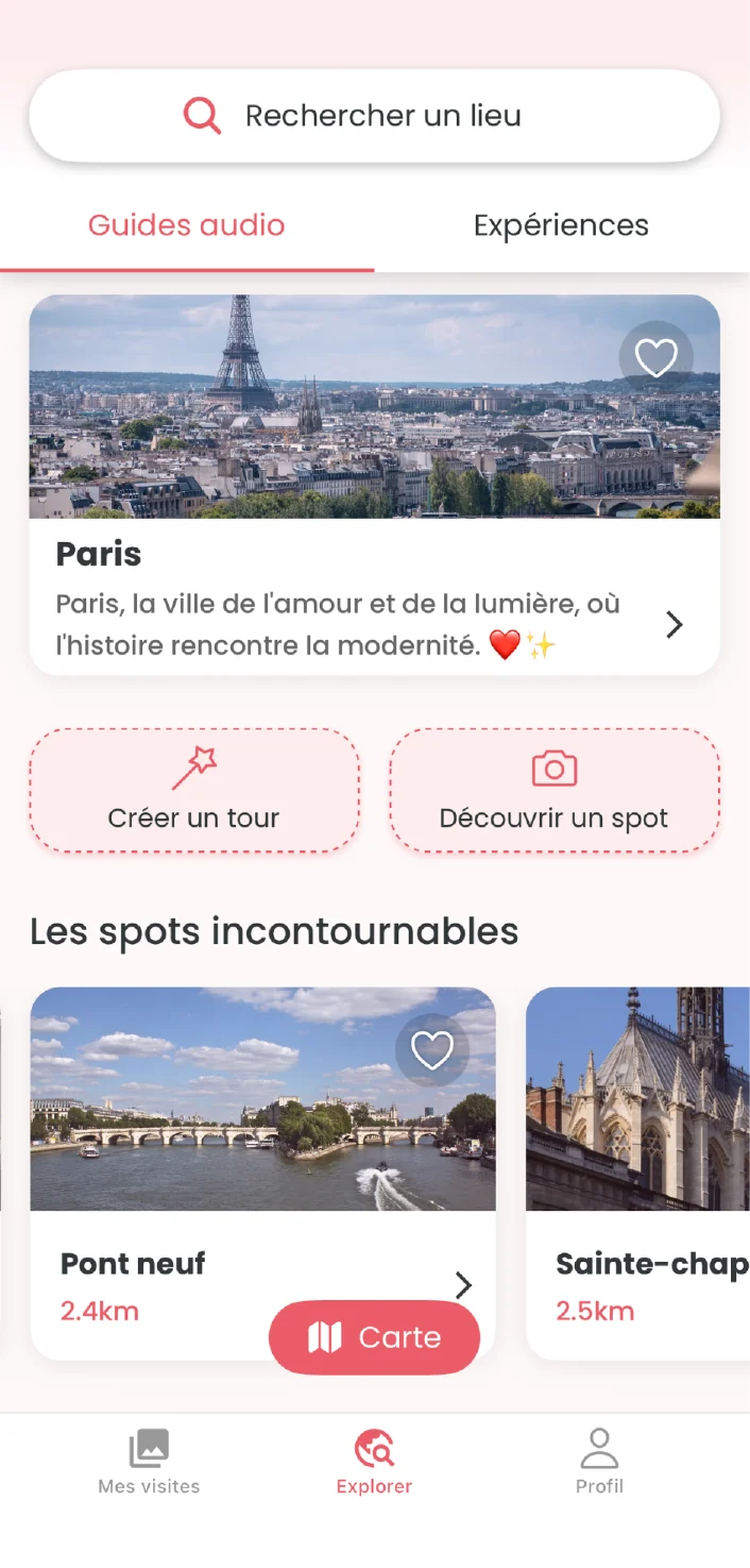 Une fois l'application installée, vous pourrez explorer des monuments autour de vous et générer des audioguides personnalisés selon vos intérêts.